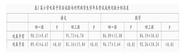 四年级两个班双盲对照安装空气负离子装置前后两个学年末考试成绩比较如表3所示。