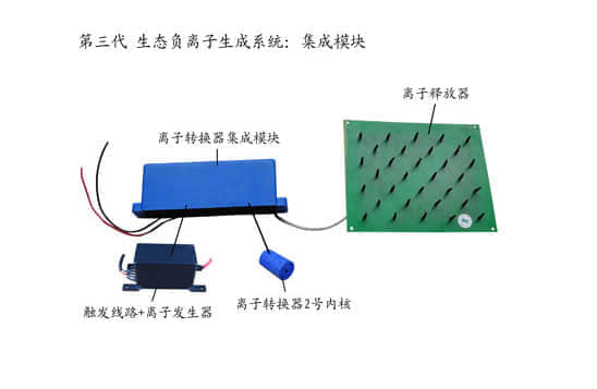 负离子转换器是一种应用于空气负离子生成设备上的转换装置,可将人工生成的负离子转换成等同于大自然的负离子。实现了小粒径、高活性、迁移距离远的生态级负离子,不使用风机外吹,空气负离子就可释放到4~5米的距离,实现了“零”噪音。